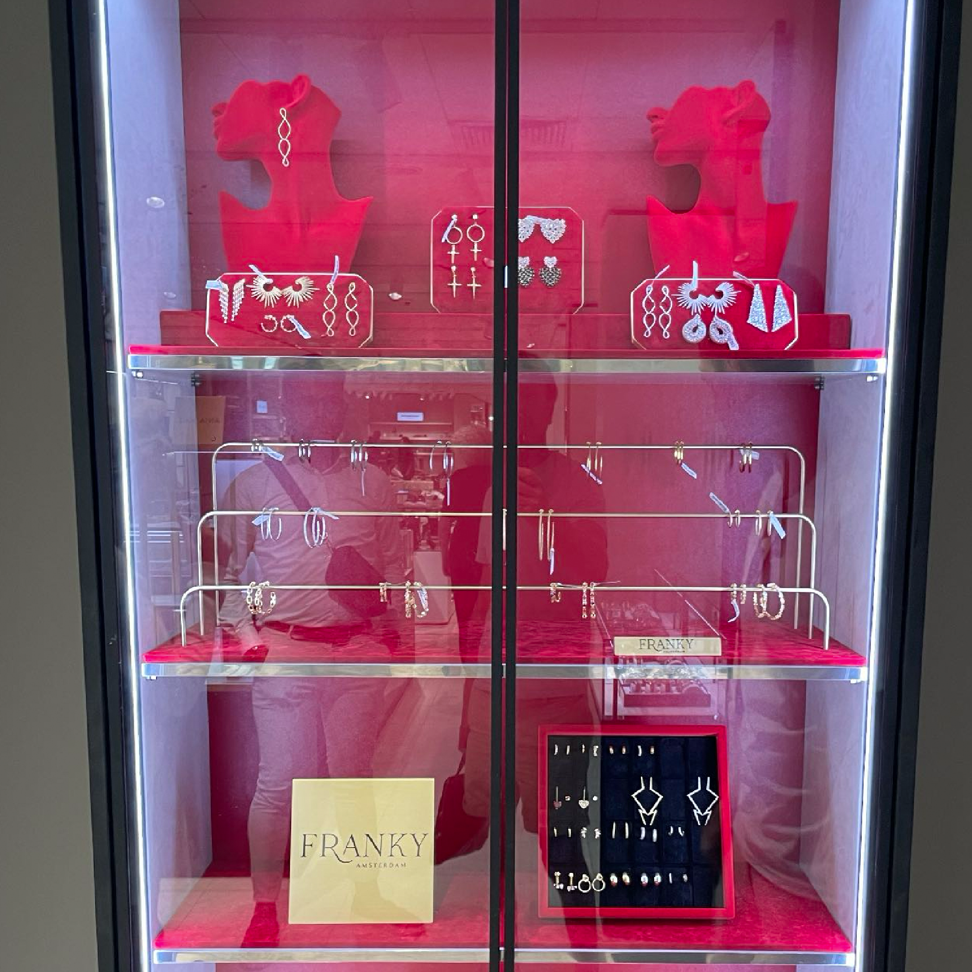 Franky is a young and upcoming jewelry brand. Until this year they had an online only sales approach. Due to its gain in popularity they were approached by leading department stores in the Benelux. New Bricks was asked to design, produce and install a pilot cabinet in De Bijenkorf Amsterdam.